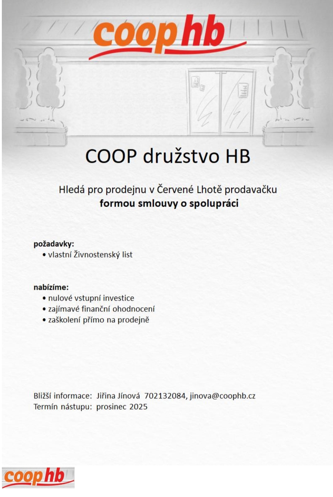 Úvod > Aktuality > Inzerát COOP družstvo HB na místo prodavačky v Červené Lhotě
